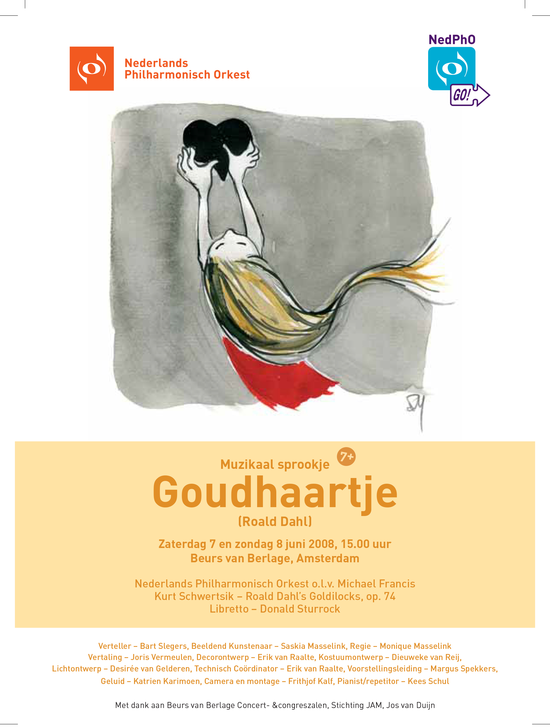 Voor NedPho Go!, de educatieve afdeling van het Nederlands Philharmonisch Orkest, vertaalde ik Goldilocks. Deze jeugdopera is gebaseerd op het bekende verhaal van Roald Dahl. Het scenario is van Donald Sturrock (Dahls biograaf), de muziek van de Oostenrijkse componist Kurt Schwertsik. De verteller tijdens de concerten was de Vlaamse acteur Bart Slegers. In het voorjaar van 2016 voerde ook het Philips Symfonie Orkest de opera uit, ditmaal met Hugo Haenen als verteller. Hier zijn twee pagina’s van mijn vertaling te vinden.